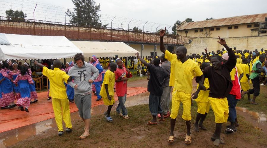 Wir beteten, dass unser allmächtiger Gott, Schöpfer des Himmels und der Erde, doch einfach den Regen stoppen möge, doch ... es regnete weiter. Mittlerweile ging es auf die Mittagszeit zu und wir fassten den Entschluss, einfach anzufangen. So startete der Chor inmitten der Pfützen und lockte mit einer Super- Vorstellung und den wunderbaren Liedern die Häftlinge an. Sie standen zu Hunderten rundherum an der Mauer und folgten der Veranstaltung mit leuchtenden Augen und fröhlichem Klatschen.